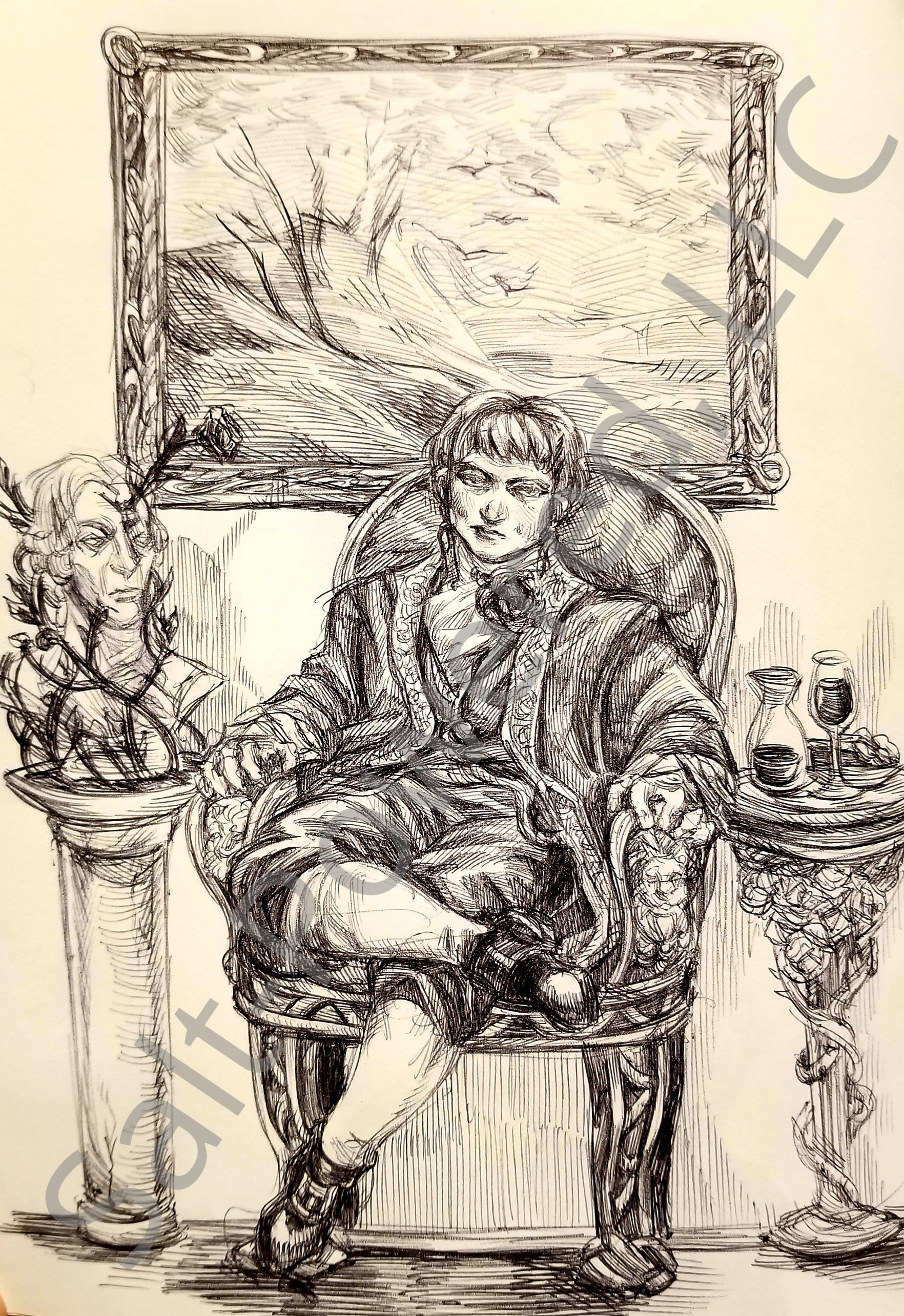 As a side-effort to our main pipeline of artwork, we asked Rae for their interpretations of a number of characters in our timeline. Here is Le Markhan (or Les Marquains, in the Riverlands tongue), from She-Lord of Ka! He’s looking a little svelter than he ought (he was not a thin man), but it’s a work in progress. I’m a huge fan of the imagery Rae brought to these pieces. Enjoy!