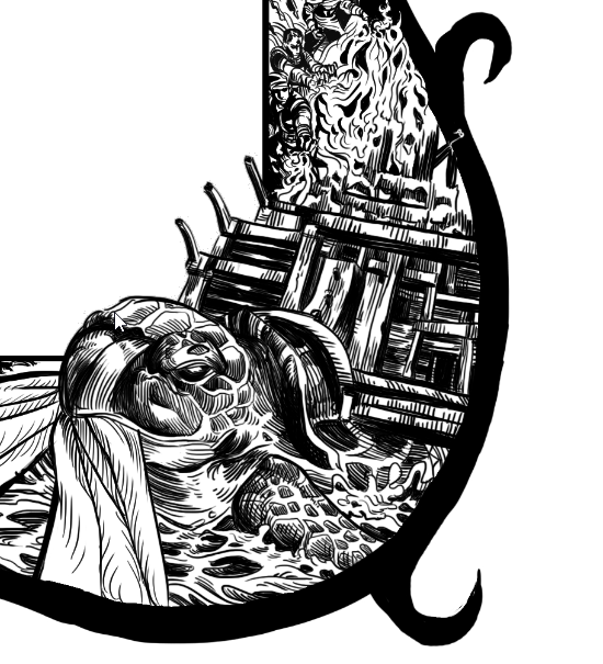 With this certainty, the Merchant finds himself in the plaza before the palace which was once a temple. The northern and eastern launches have been blockaded; the bridge to the trade barges is ablaze, and the flames now lick the palace’s western walls. The southern dock below swarms with the enemy, and above, the Riversworn guard their trapped princes, awaiting reinforcement that will not arrive in time, hopefully and foolishly unaware that their only path out is through the force massing beneath them. The Merchant draws his sword and locks his shield to his arm. His task is impossible but clear: He must somehow give them enough time.