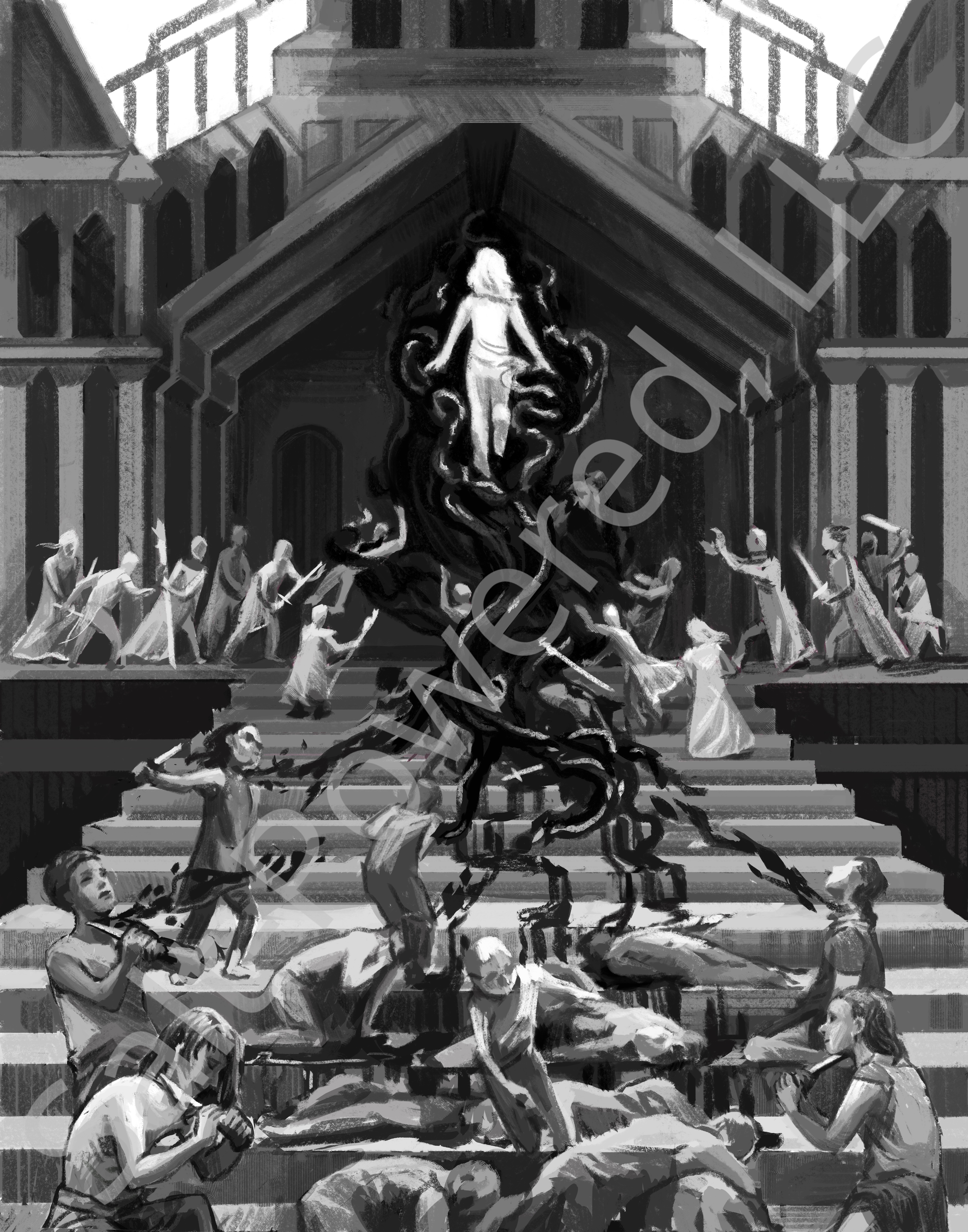 Quickly, she ascended to the main floor, clawing through five guards on her way, sprinting to the audience hall, bare, blood-drenched feet slapping on stone as she entered to find Zacharus with seven of his guards.